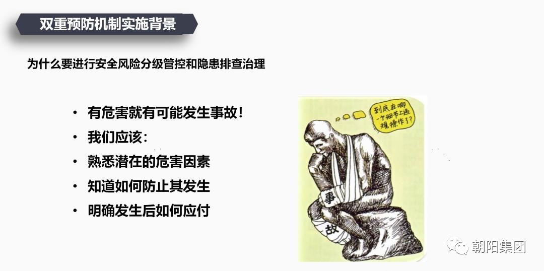 在培訓活動中,朝陽集團申總詳細給員工講解了風險分級管控、隱患排查治理的概念、方法和流程等,并強調(diào)了雙重預防機制在安全生產(chǎn)中的重要性。申總首先對雙重預防機制的定義進行了闡述,再對風險分級管控與隱患排查治理的雙重預防機制進行了深入的講解。